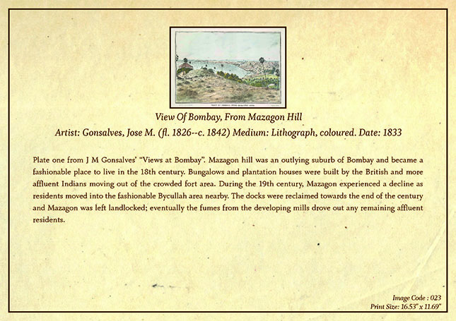Plate one from J M Gonsalves’ “Views at Bombay”. Mazagon hill was an outlying suburb of Bombay and became a fashionable place to live in the 18th century. Bungalows and plantation houses were built by the British and more affluent Indians moving out of the crowded fort area. During the 19th century, Mazagon experienced a decline as residents moved into the fashionable Bycullah area nearby. The docks were reclaimed towards the end of the century and Mazagon was left landlocked; eventually the fumes from the developing mills drove out any remaining affluent residents.